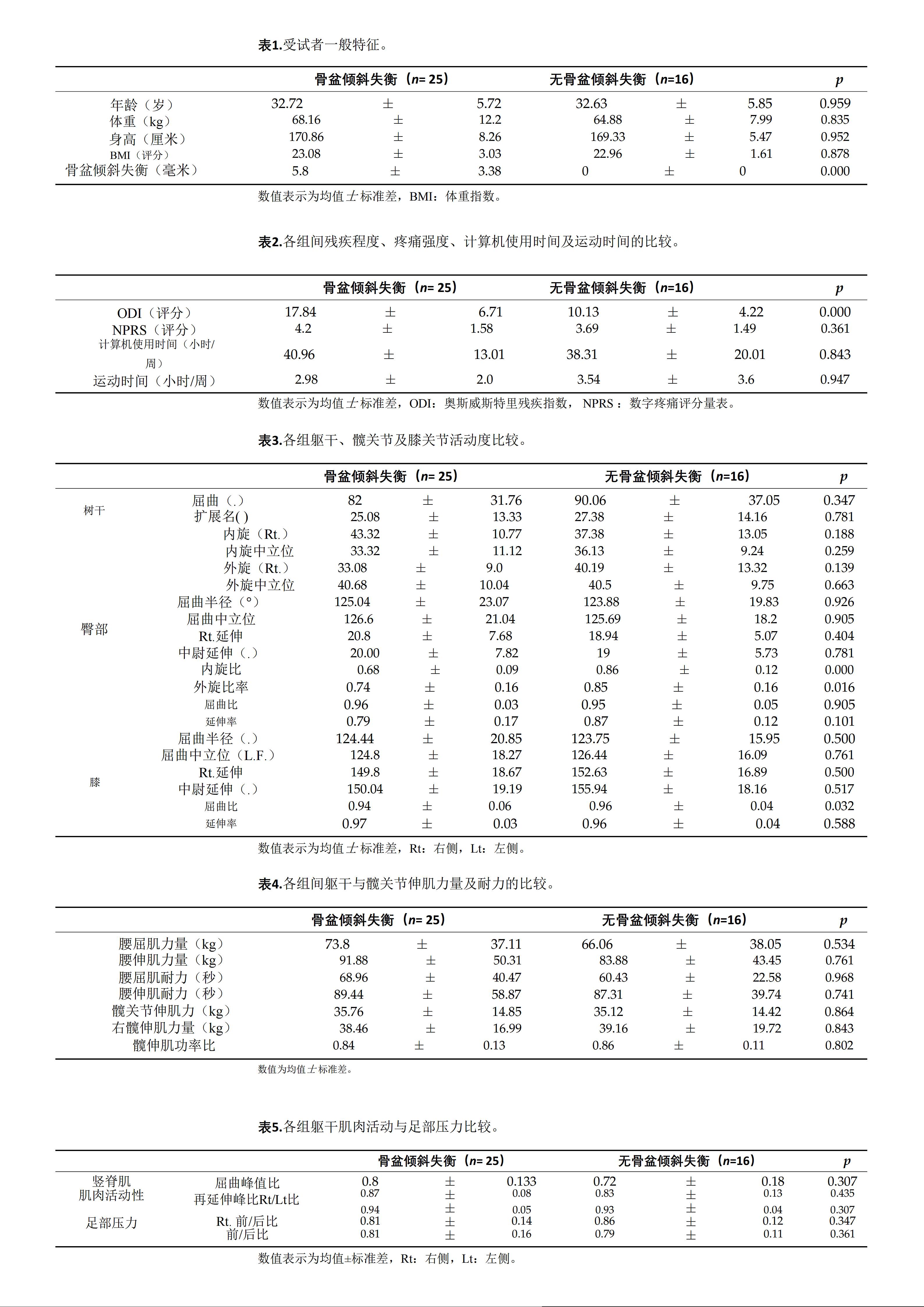 此外,两组在竖脊肌活动度、足部压力分布上也无显著差异,进一步证明了骨盆倾斜失衡是独立于肌力、久坐时长的腰痛危险因素。