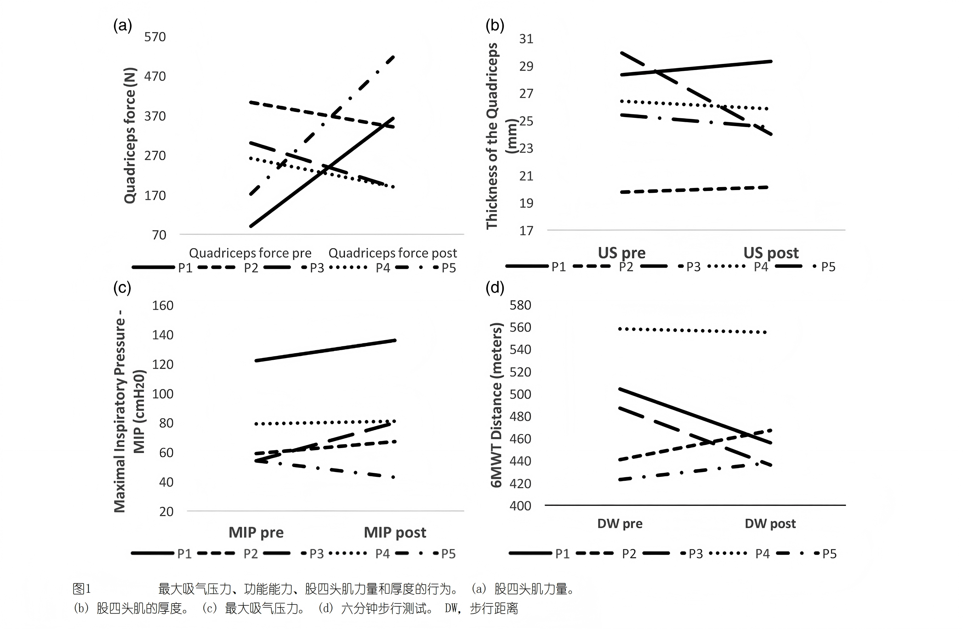 功能活动能力上,2 名受试者(P2、P5)的 6 分钟步行距离明显增加,分别提升 26m 和 15m,其中 P5 同时伴随股四头肌力量的提升,说明肌肉力量的改善直接助力了日常活动能力的提高,而这两名受试者本身有一定的活动基础,也提示运动基础与训练效果存在正向关联。